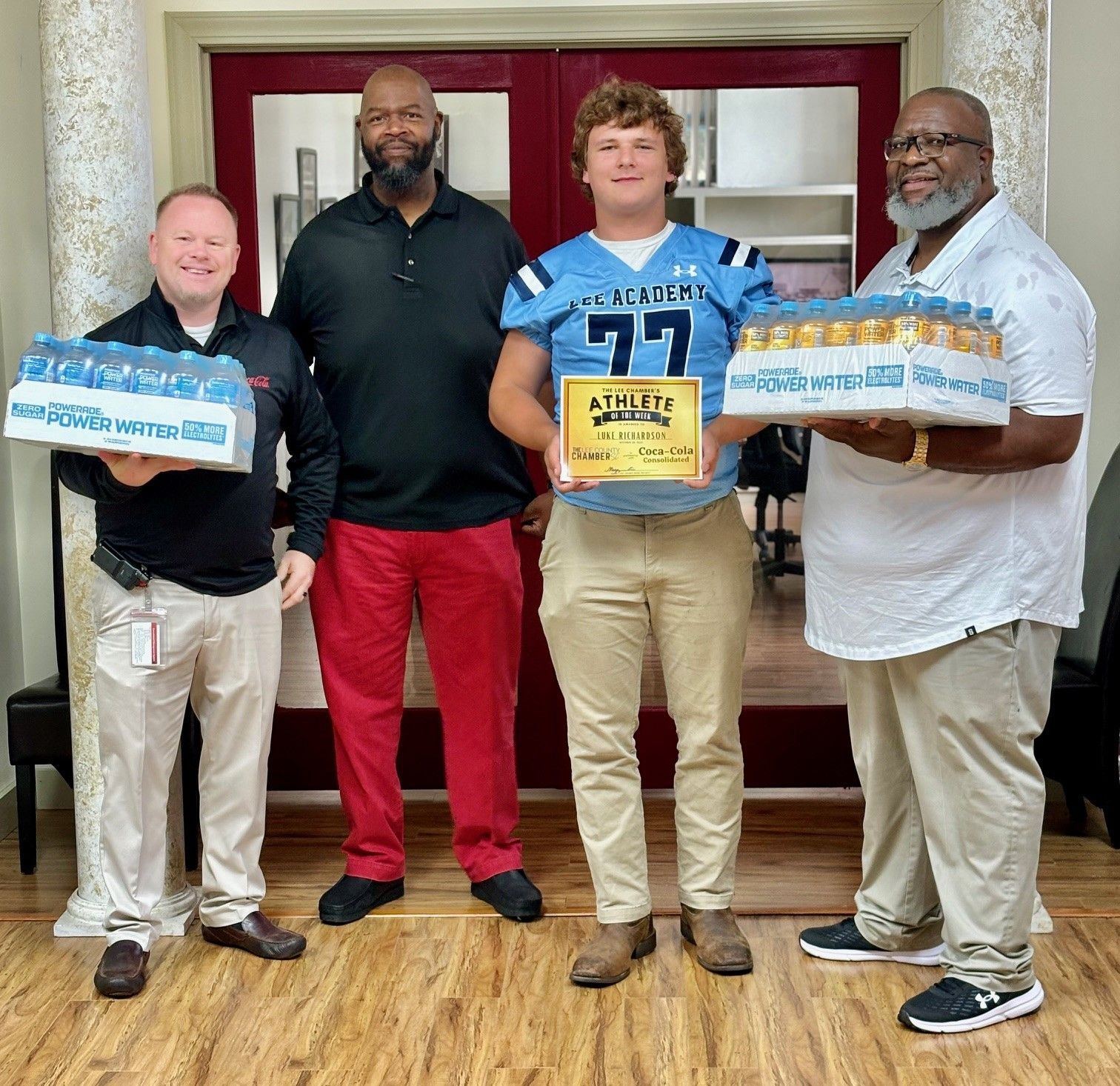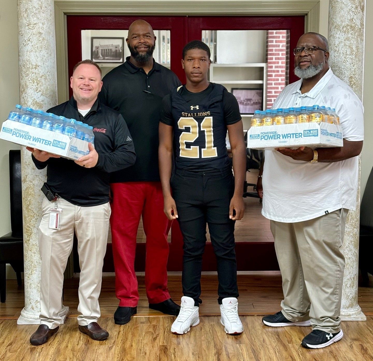 This week Luke Richardson (Lee Academy) and Zion Hannibal Lee Central High School) were chosen by their coaches as Athletes of the Week. Since it's homecoming week at both schools, we were so happy to have cheerleaders Zana Brazell (Lee Academy) and Khya Cooper (Lee Central High School) join the athletes Monday for the event. Coca-Cola Consolidated provided gifts for all four athletes and cases of Powerade Power Water for each school.